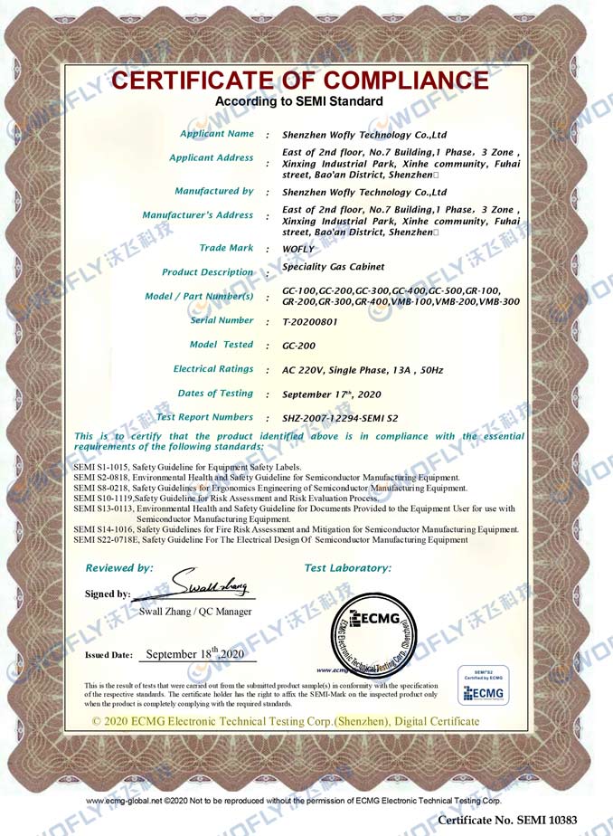 最后,沃飞WOFLY全自动特气柜(GC)拥有SEMI S2认证,SEMI S2(Safety Guidelines for Semiconductor Manufacturing Equipment)是针对半导体制程设备供货商所规范的基本健康和安全要求安全标准,代表了半导体厂家的基本安全要求。