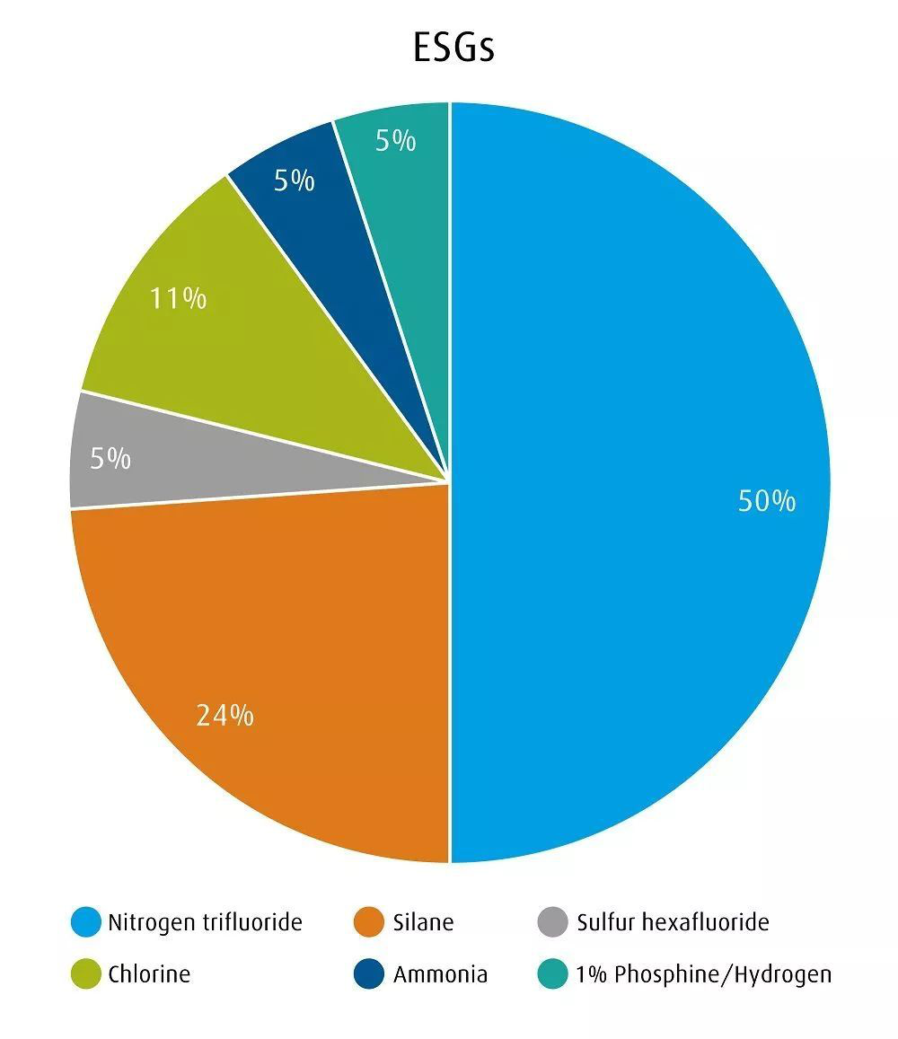 这些气体中电子特种气体(ESG)包括硅烷、三氟化氮、氟(现场产生)、六氟化硫、氨气以及磷化氢混合物,占显示屏制造中使用气体的52%。比如硅烷:SiH4是显示屏制造中最关键的气体之一,与氨气(NH3)结合使用,形成用于非晶硅(a-Si)晶体管的氮化硅层,与氮气(N2)结合使用,形成用于低温多晶硅(LTPS)晶体管的预准分子激光退火非晶硅(a-Si),或与氧化亚氮(N2O)结合使用形成金属氧化物(MO)晶体管的氧化硅层。